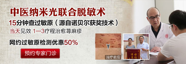 我院采用“中医纳米光联合脱敏术疗法”治疗荨麻疹。该疗法应用汉方中药对患者进行内在调理,结合中药熏蒸治疗系统,将中药直接渗透皮肤,改变患者的过敏体质;并配合艾灸治疗,舒经活络,增强免疫,正规治疗荨麻疹。
