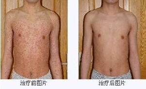 治疗前:2015年6月12日,家住太原市小店的李先生来到了太原肤康中医皮肤病医院。到院后,李先生告诉主任,他当天早上身上发风团,先是背痒,抓挠后皮肤发红,后风团扩散到前胸,他服药后没有明显作用。