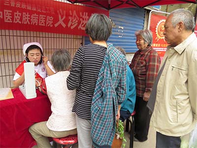 义诊过程中,一位六十三岁的大妈早早就徘徊在了义诊台前,肤康医生仔细的为老人做了身体检查,在测量血压的时候,发现胳膊上有明显的红疹,当问及时,大妈说偶尔会有瘙痒,但并无其他不适,也就没有在意。经肤康医生的认真诊断发现,是过敏性皮炎。现场为老人讲解了皮炎的成因、症状、治疗方法、护理等知识并免费提供了治疗皮炎类药品。